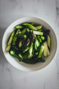 - Grüner Spargel – frisch vom Wochenmarkt oder Hofladen, fest und mit nicht zu trockenen Schnittstellen. Lieber etwas dünnere Stangen als dicke, dann gart er gleichmäßiger mit.