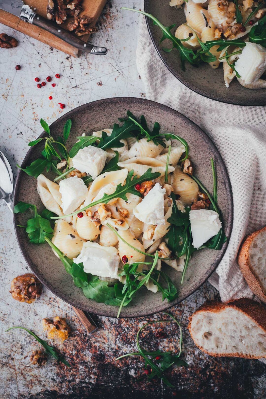 Pasta mit Ziegenkäse, Rucola & karamellisierten Walnüssen