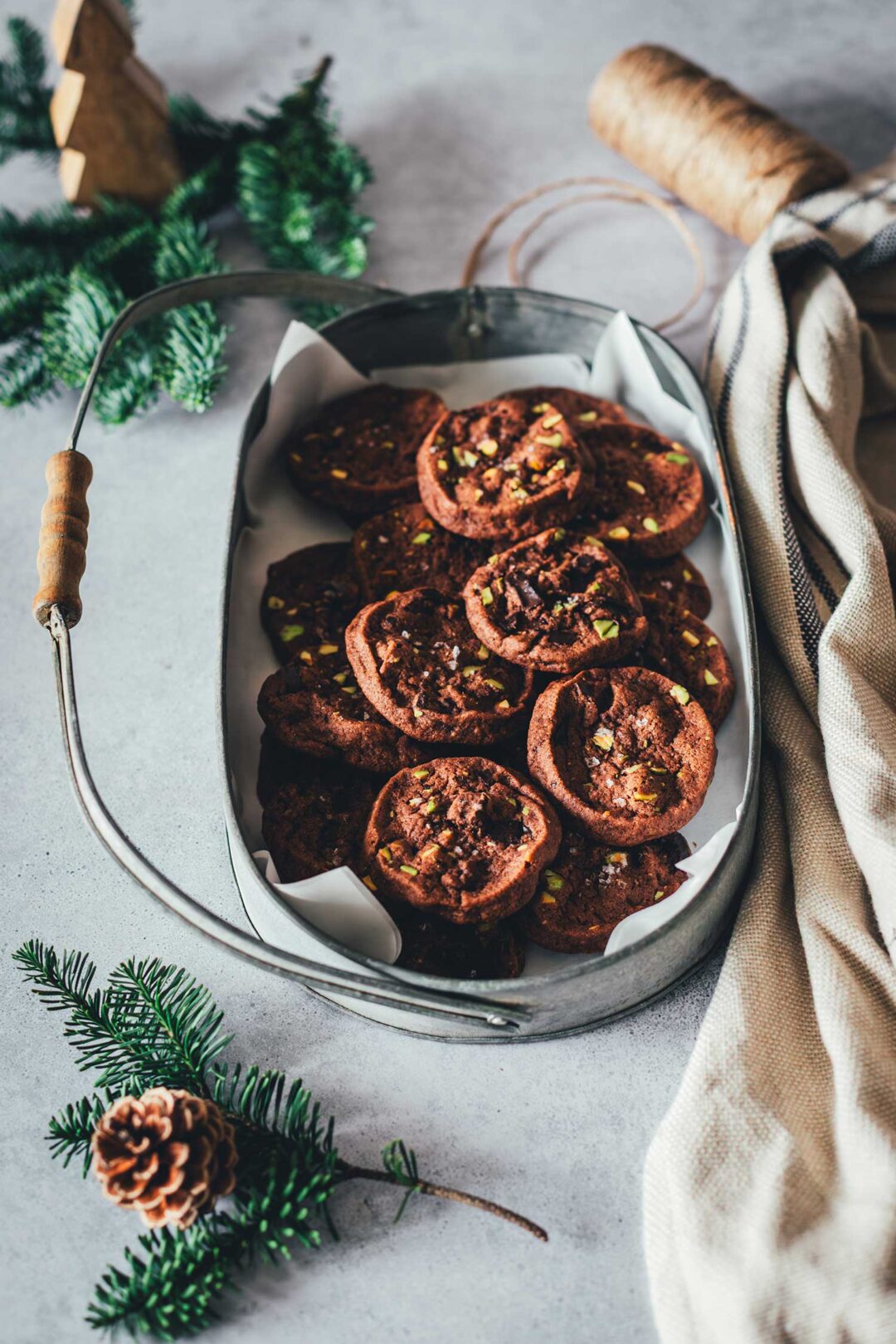 Das Ergebnis sind wunderschöne, leicht rustikale Schokoladen-Pistazien-Cookies, die aussehen, als hatte man deutlich mehr Aufwand betrieben, als tatsächlich dahinter steckt… Für mich haben die Cookies jedenfalls einen festen Platz in der Keksdose bekommen. Und ich weiß jetzt schon, dass sie auch im Januar, Februar und im restlichen Jahr genauso gut funktionieren!