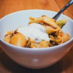 Zum Ende der Garzeit hin die Hackfleischmischung unter den Wirsing rühren und noch mal kurz erwärmen. Die Nudeln abgießen und ebenfalls mit Unterrühren. Die Mischung auf zwei Schüsseln verteilen und mit einem Klecks Schmand servieren.